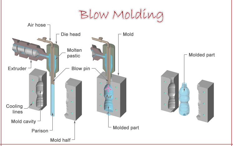 Blow molding is a manufacturing process that allows hollow plastic parts to be formed. Air pressure is used to inflate soft plastic into a mold cavity. The technology of blow molding comes from the glass industry; and plastics compete in the disposable and recyclable bottle market. The three main types of blow molding are: extrusion blow molding, injection blow molding, and injection stretch blow molding. Blow molding can make containers and jars such as blow-molded PET or PETE Jars and Containers for Packaging.