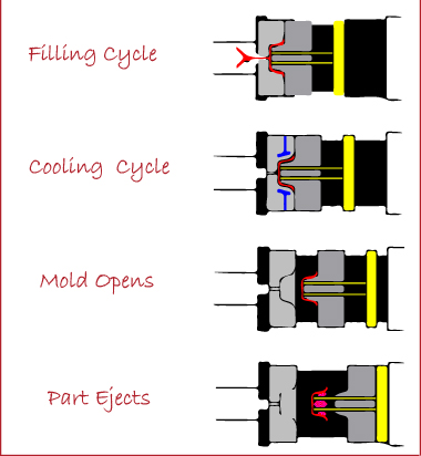 Injection molding manufacturers produces high numbers of plastic parts with high quality, very fast. Material is fed into a heated barrel where it is also melted. When smooth enough, the material is injected through a nozzle under pressure (filling cycle) to fill a mold cavity and then cools off (cooling cycle). Thereafter, the mold opens and the part ejects.
